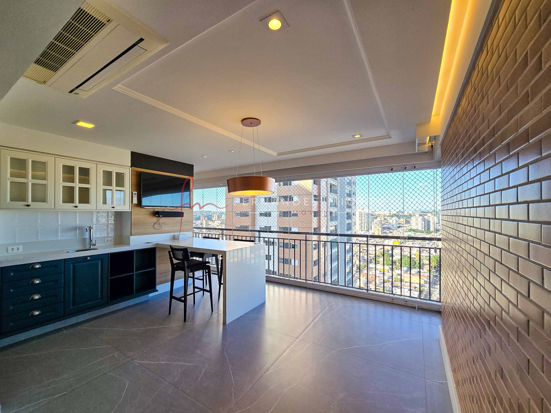 - varanda gourmet, com cortina elétrica, tv com caixa de som, fechada em vidro e vista livre